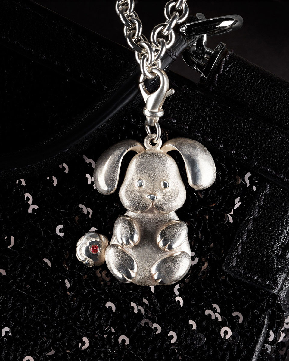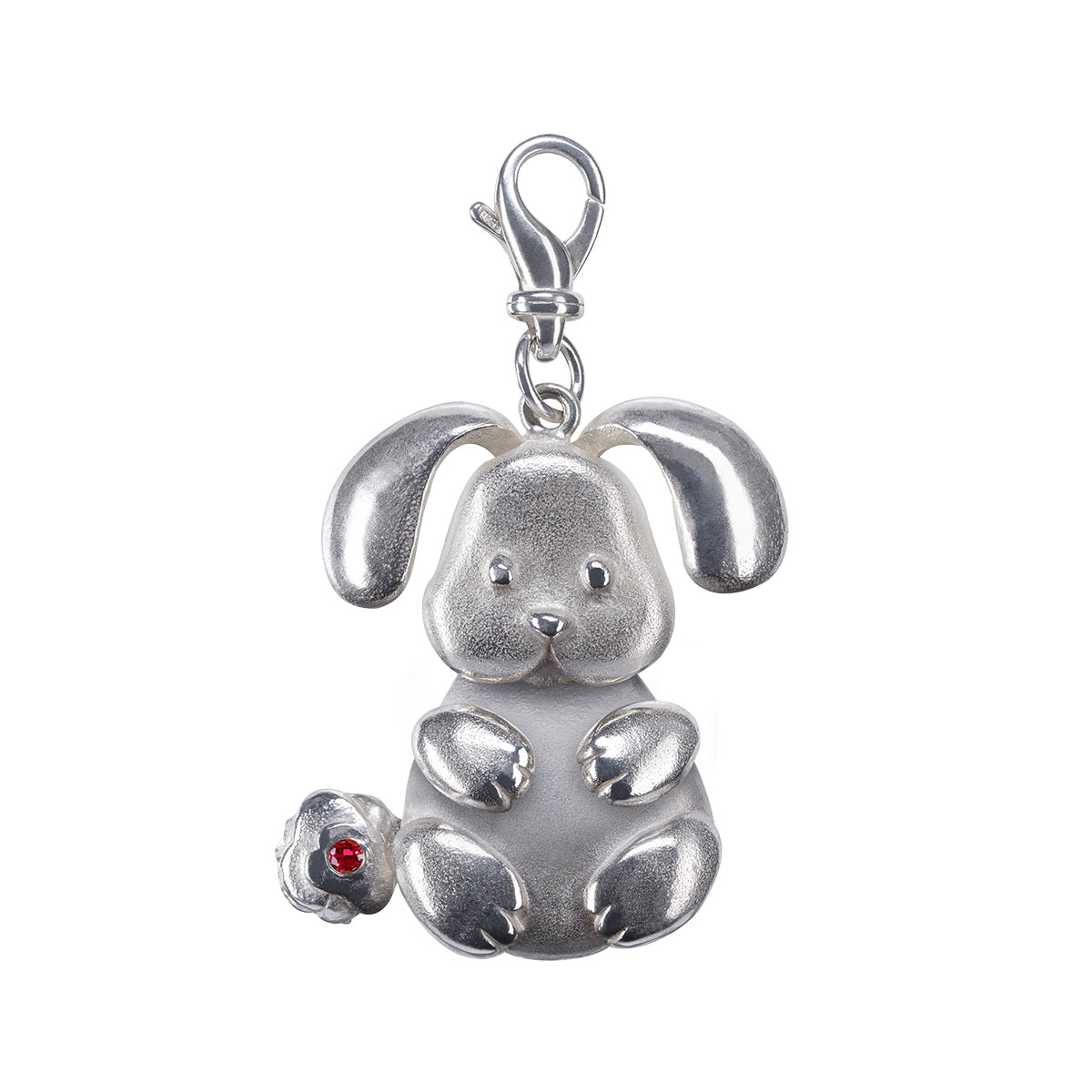 ~ .935 tarnish resistant silver ~ 2.5mm AAA grade non-conflict ruby ~ Handcrafted in New York ~ Moving parts: ears, head, front paws, tail ~ Height 4.3cm, Width 3.6cm ~ Height with clasp 6.0cm ~ Clasp .925 silver from Italy ~ Years: 1927, 1939, 1951, 1963, 1975, 1987, 1999, 2011, 2023, 2035
