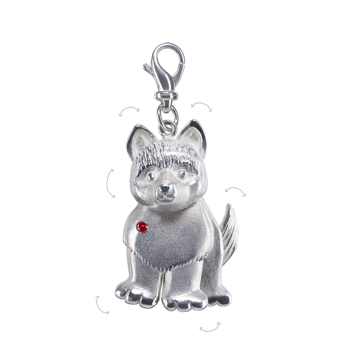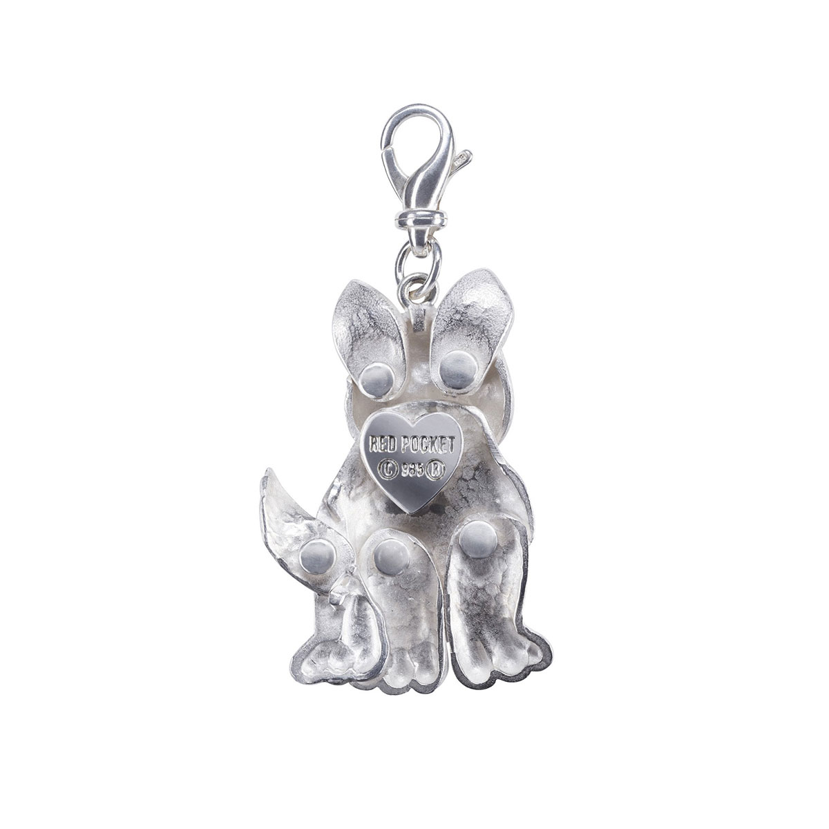 ~ .935 tarnish resistant silver ~ 2.5mm AAA grade non-conflict ruby ~ Handcrafted in New York ~ Moving parts: ears, head, tail, legs ~ Height 4.6cm, Width 3.2cm ~ Height with clasp 6.5cm ~ Clasp .925 silver from Italy ~ Years: 1922, 1934, 1946, 1958, 1970, 1982. 1994, 2006, 2018, 2030