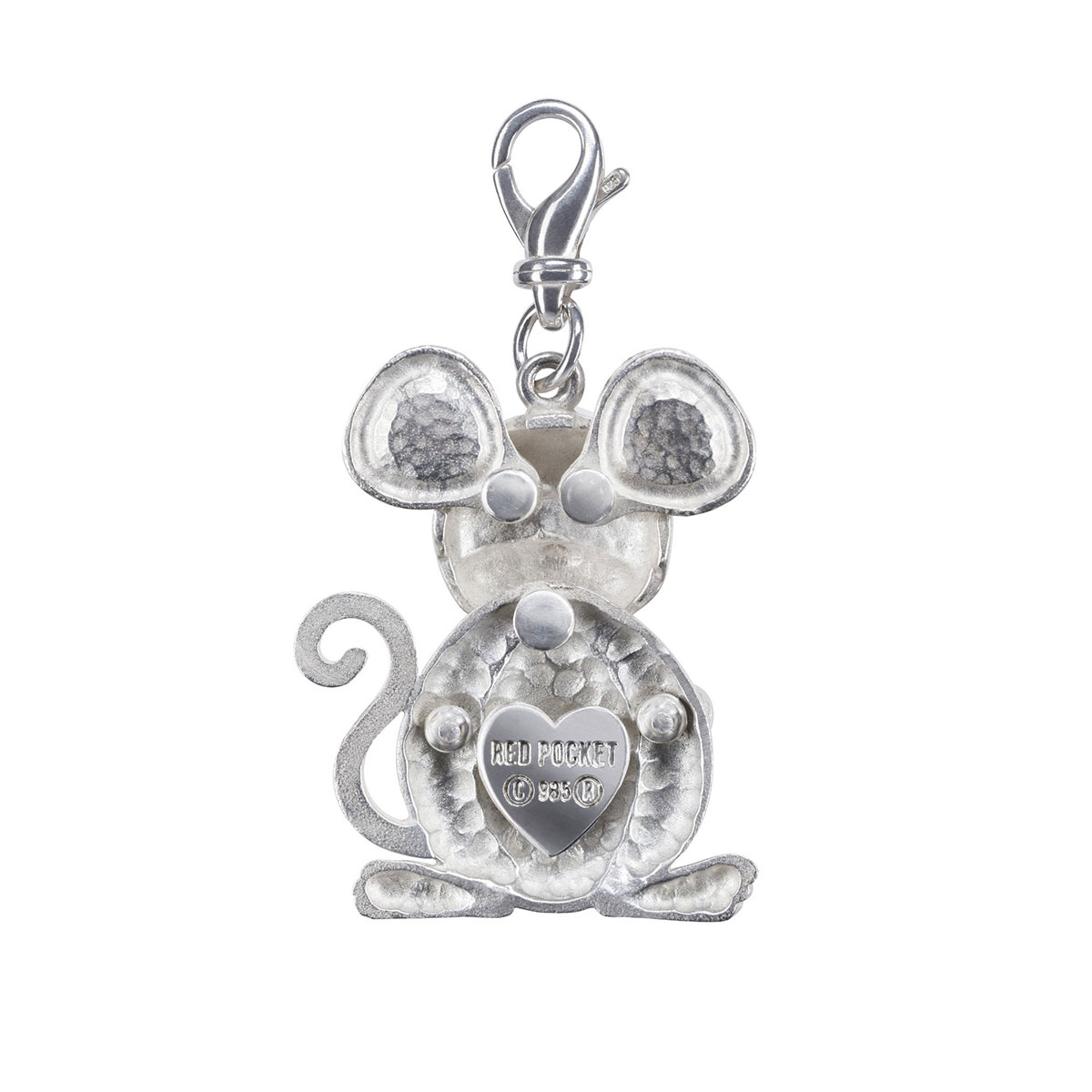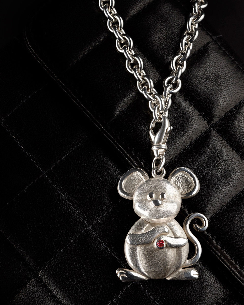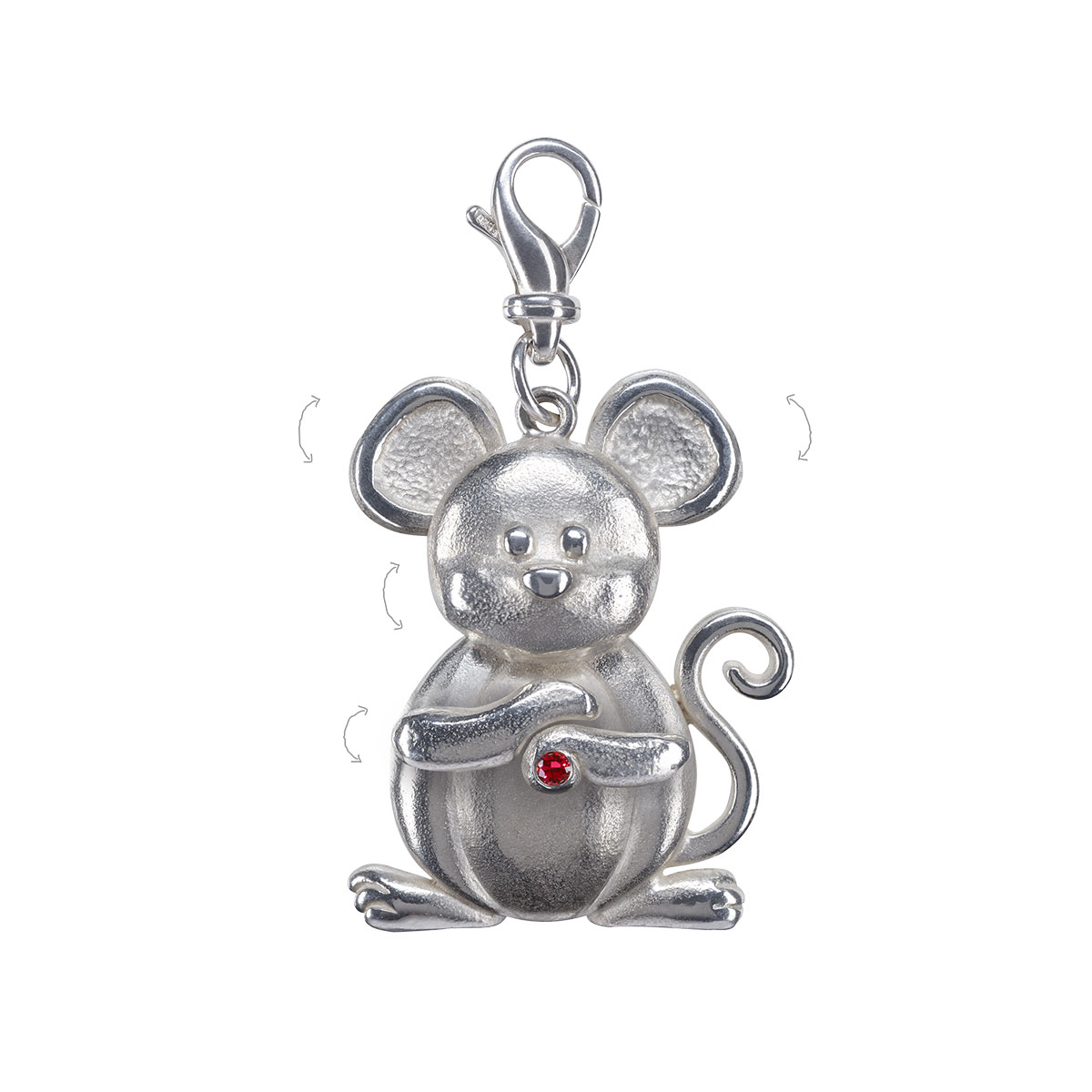 ~ .935 tarnish resistant silver ~ 2.5mm AAA grade non-conflict ruby ~ Handcrafted in New York ~ Moving parts: ears, head, hands ~ Height 4.3cm, Width 3.3cm ~ Height with clasp 6.0cm ~ Clasp .925 silver from Italy ~ Years: 1924, 1936, 1948, 1960, 1972, 1984, 1996, 2008, 2020, 2032